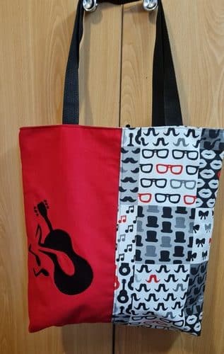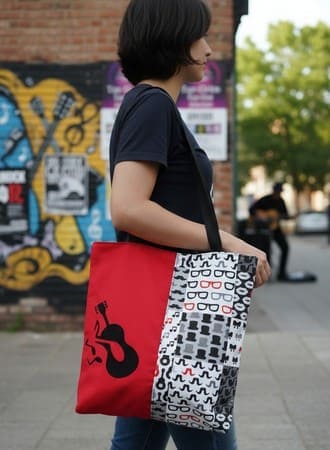 L’alliance est explosive : la force d’un rouge vibrant rencontre le dynamisme d’un tissu patchwork aux motifs iconiques de lunettes, chapeaux et notes de musique. Au centre, la broderie noire unique d’une guitare stylisée semble s’animer au milieu des notes, créant un contraste visuel puissant et percutant.