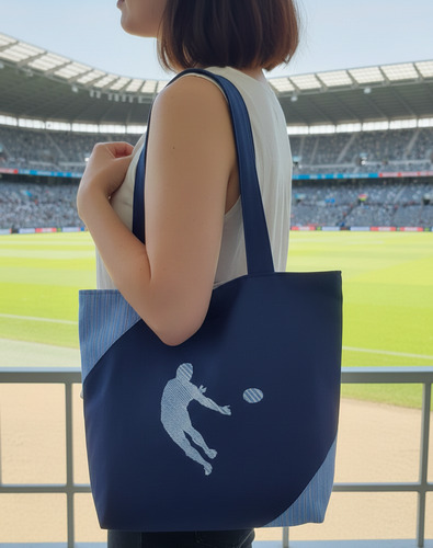 L’esthétique est celle du mouvement pur : sur un fond bleu marine profond, la broderie centrale unique capture la silhouette d’un joueur en pleine extension, s’élançant pour aplatir le ballon ovale. L’alliance des tissus avec des découpes courbes en bleu ciel rayé sur les coins rappelle les lignes d’un stade et apporte une structure dynamique et moderne.
