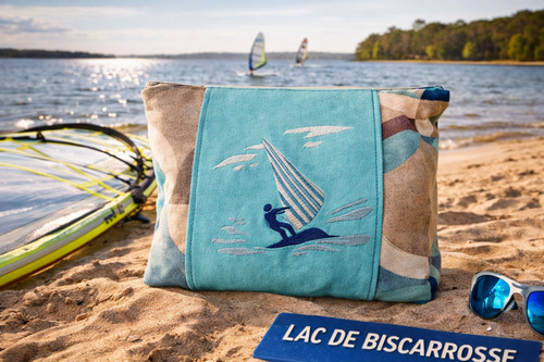 La maîtrise de YBcreations s’adapte à la ligne de navigation. L’orientation du tissu a été travaillée horizontalement pour stabiliser la trajectoire de la planche brodée, garantissant une tenue impeccable qui respecte l’équilibre visuel de cette scène de sport nautique.