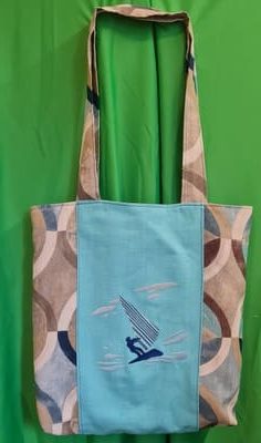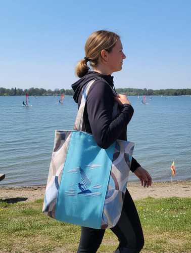 L’esthétique est une bouffée d’air marin : une large bande centrale bleu lagon accueille la broderie précise d’un véliplanchiste domptant les flots. Ce panneau est encadré par des tissus aux motifs circulaires évoquant les remous de l’écume et le dynamisme des vagues, créant un contraste moderne et rafraîchissant.