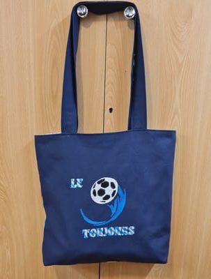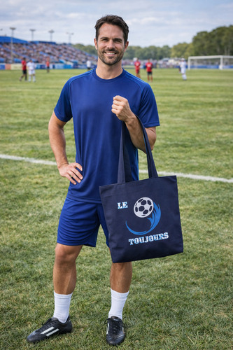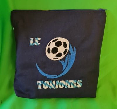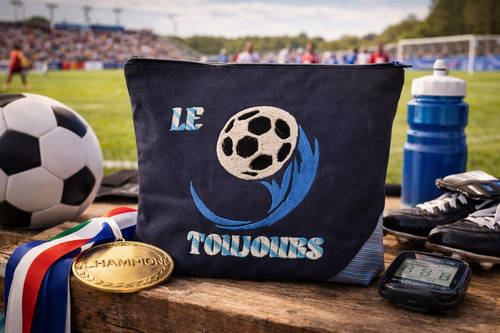 L’esthétique est celle de la victoire : un bleu marine profond et intense sert de base à une broderie centrale percutante. On y voit un ballon de football stylisé, propulsé par une traînée dynamique qui semble déchirer le textile. L’alliance entre la robustesse du tissu et la finesse de cette broderie unique crée un contraste moderne, affirmant un caractère résolument sportif et fier.