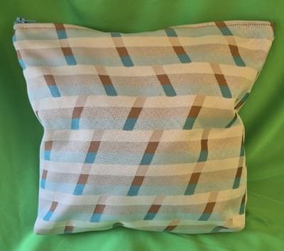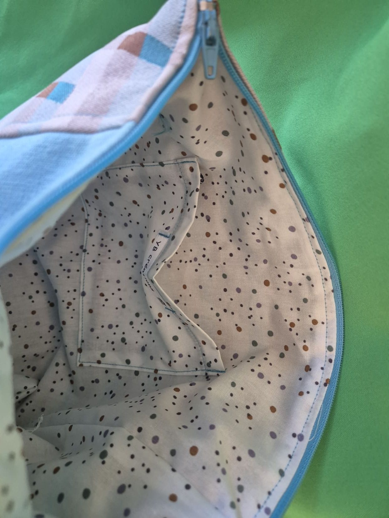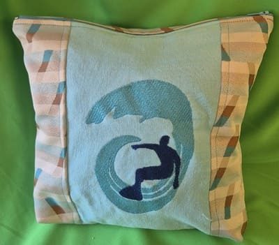 L’esthétique est une véritable bouffée d’iode : une bande centrale bleu ciel met en scène une broderie circulaire dynamique où un surfeur s’inscrit au cœur d’une vague stylisée. Les panneaux latéraux, aux motifs de rayures verticales dans des tons sable et grisé, évoquent la texture des dunes et les nuances de la côte, créant un ensemble harmonieux et solaire.