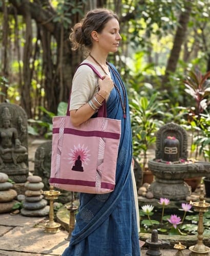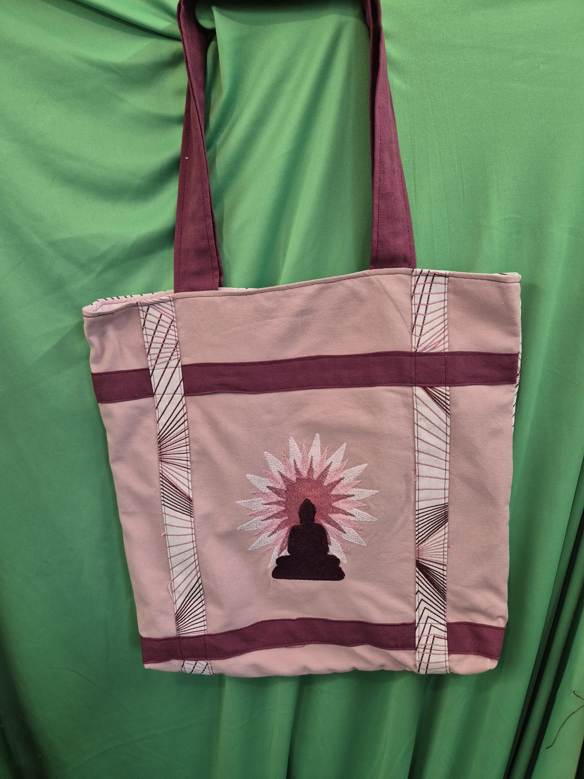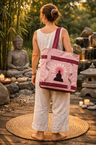 L’esthétique est une méditation sur la lumière : sur un tissu vieux rose évoquant la clarté d’une aurore sacrée, se détache la broderie noire d’une silhouette en méditation profonde, couronnée par une aura solaire. L’alliance avec les bandes de patchwork aux motifs rayonnants crée une structure dynamique qui semble diffuser une énergie apaisante et protectrice.