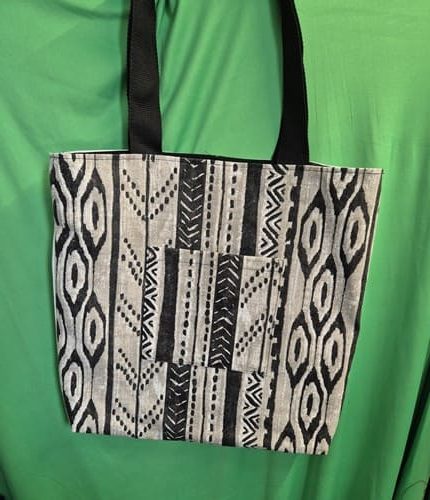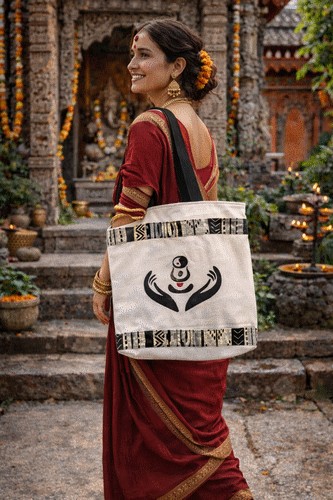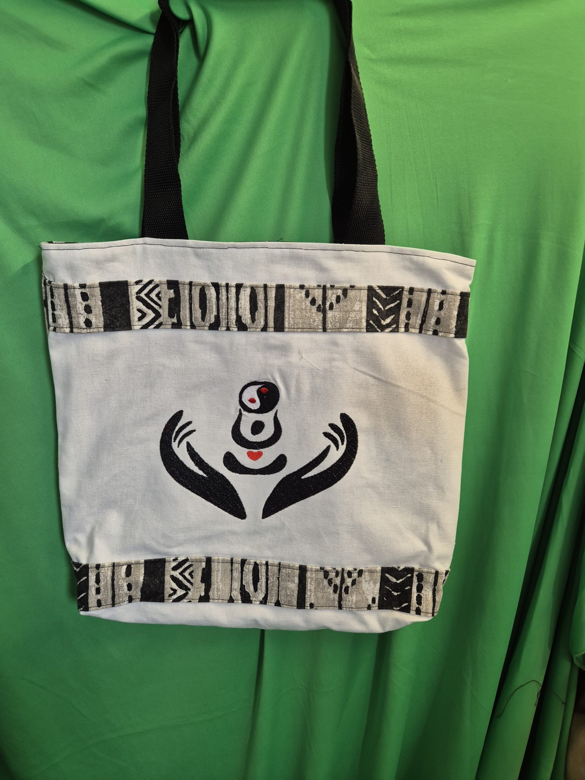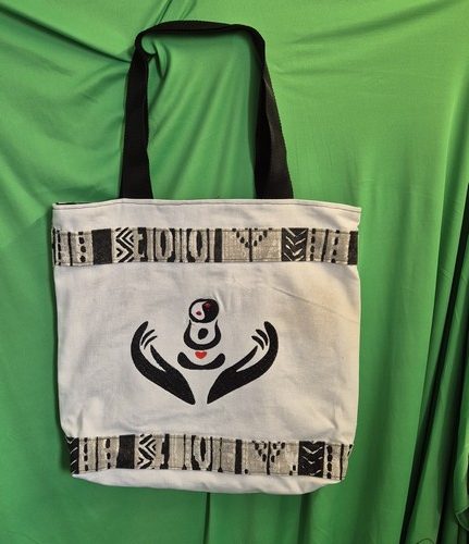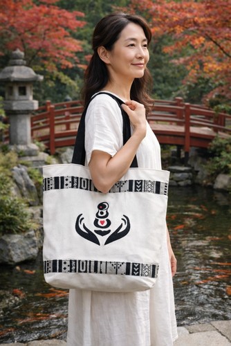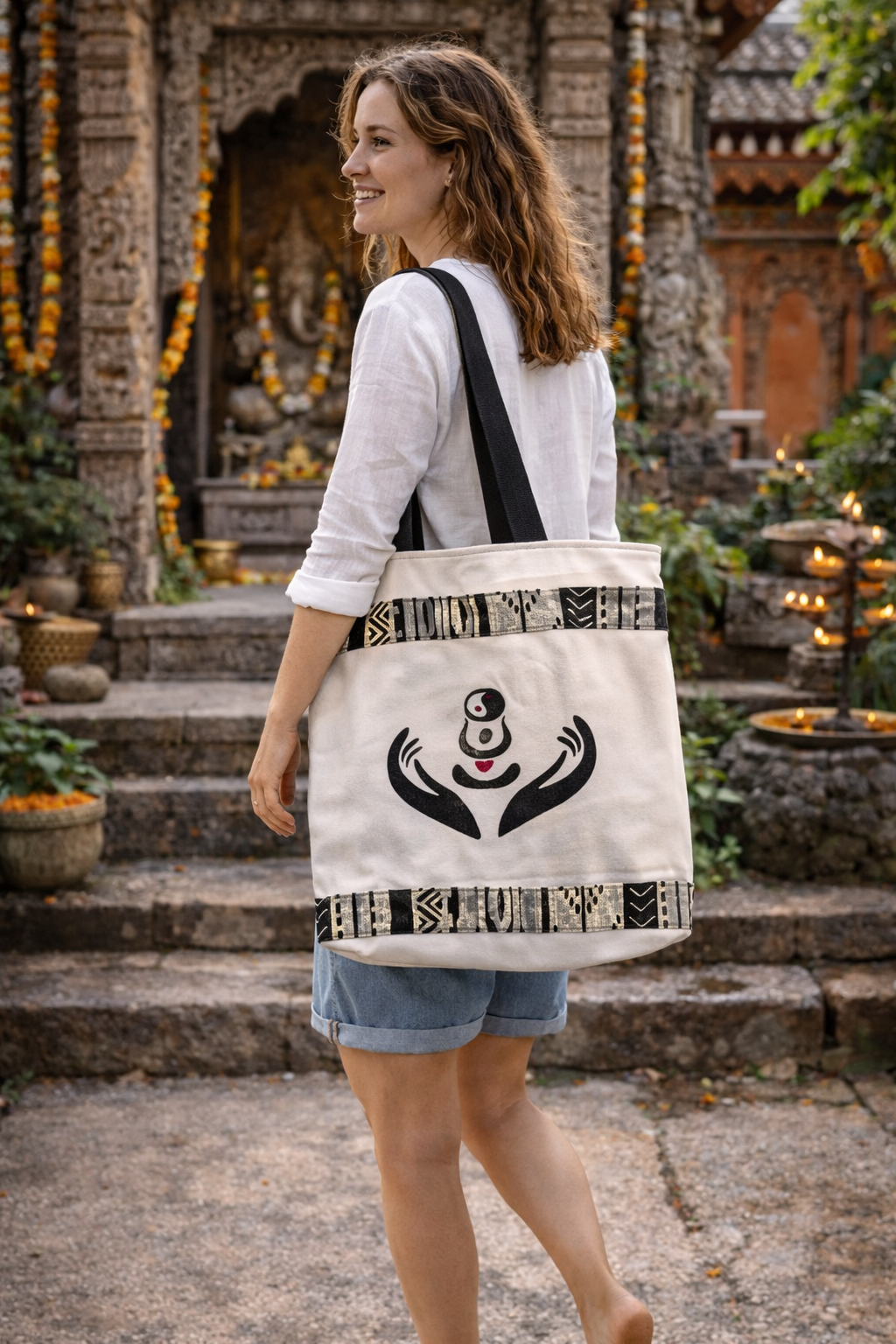 L’esthétique est une leçon de minimalisme spirituel : sur un tissu blanc immaculé, évocation de la vacuité et de la lumière, une broderie noire intense dessine le geste sacré entourant le cercle de l’unité. L’alliance avec les bandes de patchwork aux motifs géométriques noirs et ocres évoque la structure des temples et la rigueur de la pensée bouddhiste, créant un équilibre visuel à la fois puissant et apaisant.