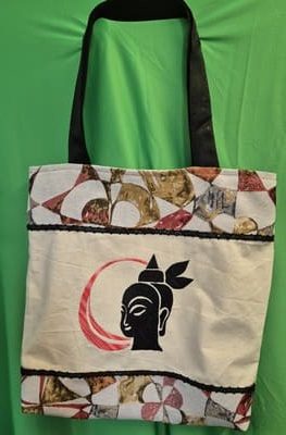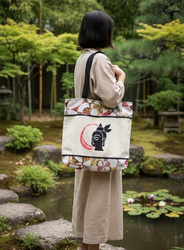 L’esthétique est une quête de l’essentiel : sur une toile de lin couleur crème, symbole de pureté, se détache le profil serein d’un Bouddha brodé de noir profond. Un croissant de lune rouge vient encadrer ce visage, symbolisant la lumière dans la nuit. Le sac est structuré par des larges bandes de tissu aux motifs circulaires, évoquant les roues du Dharma qui rythment les temples d’Orient.