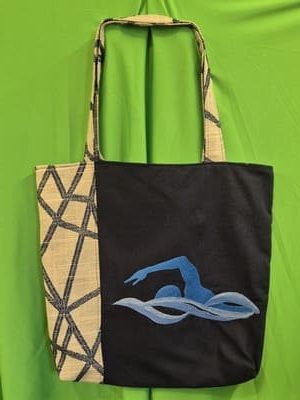 L’esthétique est une immersion dans le bleu profond : un tissu bleu marine élégant sert de fond à une broderie bleu ciel représentant un nageur fendant les vagues avec une précision chirurgicale. Le panneau latéral, aux motifs géométriques croisés évoquant les lignes d’eau d’un bassin olympique sur un fond crème, apporte une structure graphique et rafraîchissante.
