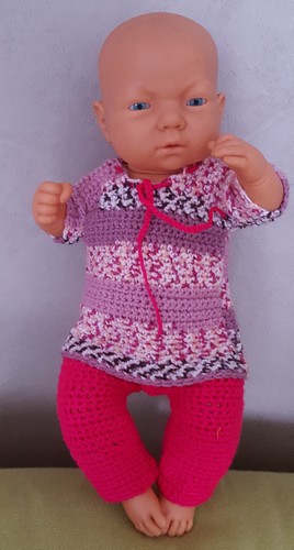 Adorable ensemble pour poupon de 40 cm . Tenue composée tunique raye mauve et rose et d’un pantalon rose, crocheté à la main. Très facile pour l’habillage car l’enfant peut tirer dessus aucune attache dangereuse. Habits lavables en machine dans un sac à lingerie sur programme laine, ne pas mettre au sèche linge.