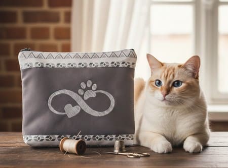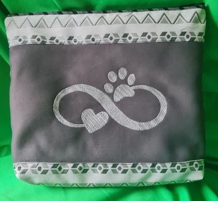 La trousse met à l’honneur une broderie texturée où le signe de l’infini, dessiné de fines hachures, enlace un cœur et une empreinte. Le contraste entre la sobriété du tissu et le relief des fils crée un objet au charme discret et au caractère affirmé.