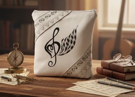 Cette création met à l’honneur une broderie d’une finesse absolue sur un tissu bleu roi profond. Une clé de sol stylisée fusionne avec une aile aux motifs ciselés, créant un jeu de texture et de lumière qui fait de cet accessoire un véritable objet d’art.