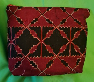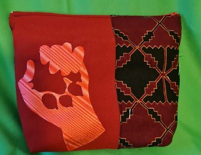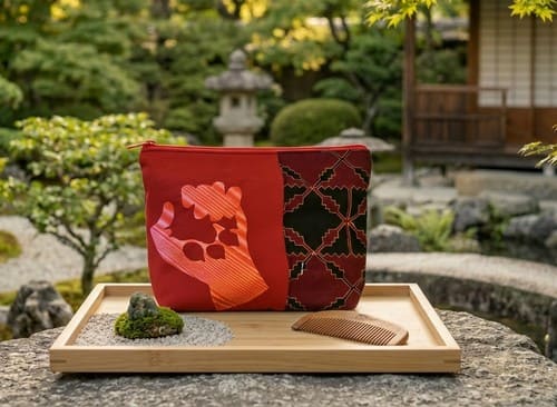 L’esthétique rappelle le calme d’une cérémonie traditionnelle : le fond bordeaux profond accueille la broderie délicate de la main de sagesse. Le contraste avec les motifs géométriques du panneau latéral apporte une structure précieuse et intemporelle à cet accessoire indispensable.