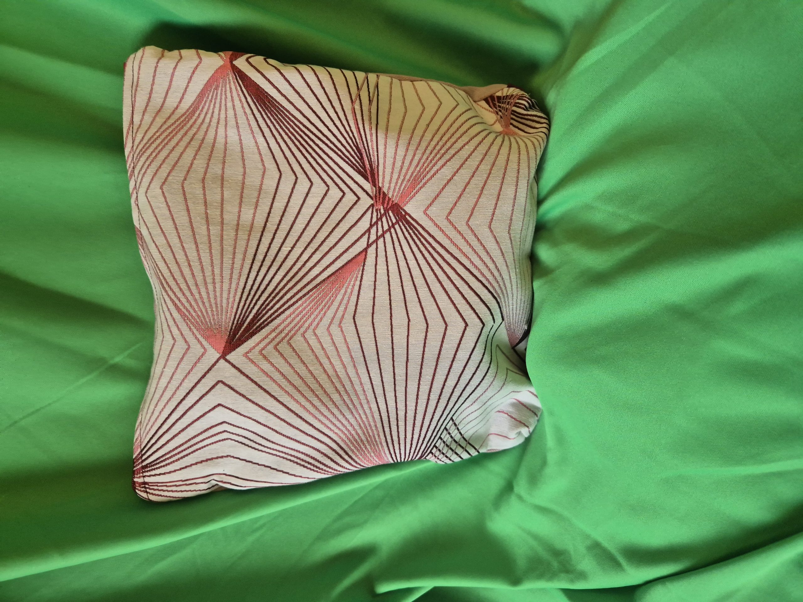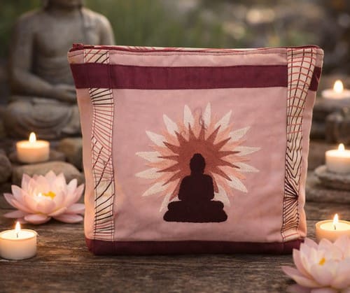 L’esthétique rappelle le calme d’un sanctuaire : le fond vieux rose apaisant accueille la broderie délicate de la silhouette rayonnante. Le contraste avec les motifs graphiques du patchwork apporte une structure spirituelle et moderne à cet accessoire indispensable, évoquant la diffusion de la sagesse.