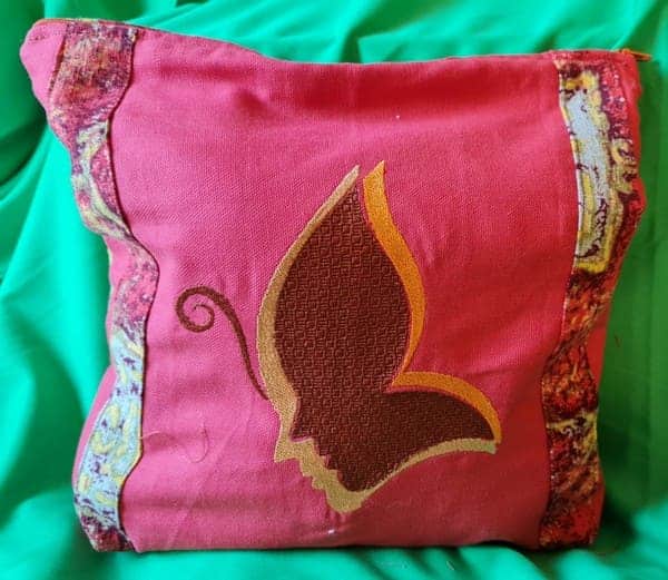 Le visuel de cette trousse repose sur une broderie personnelle, née de mon imagination et créée exclusivement pour mes articles. Ce motif délicat, où un profil de femme s’efface pour devenir l’aile d’un papillon aux reflets dorés, est une signature visuelle que vous ne trouverez nulle part ailleurs. Parce que je conçois et réalise moi-même chaque broderie, cette pièce est unique et le restera.